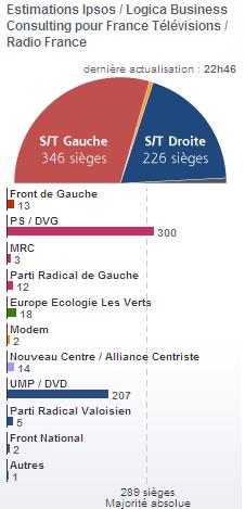 ADENDA em 20/6: como se infere da imagem inicial, este post foi construido a partir de previsões baseadas em sondagem da Ipsos à boca das urnas. Conhecidos os resultados finais e oficiais (que estão aqui), algumas coisas haveria a modificar na segunda imagem (por exemplo, o Front de Gauche não obteve 13 deputados mas apenas 10).