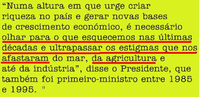 Cavaco Silva é, se não me engano, o político que mais tempo esteve no poder, como Ministro das Finanças e do Plano, como Primeiro-Ministro (10 anos) e como Presidente da República (desde 2006). É, sem dúvida alguma um dos principais responsáveis pelas políticas que nos conduziram até aqui e pela degradação acelerada em que o país se encontra. Ao insistir na protecção deste governo, contra a opinião da esmagadora maioria dos portugueses, Cavaco Silva, é também co-responsável pelo sofrimento de milhões de portugueses e pelo retrocesso civilizacional a que temos assistido. Não há discursos sobre a agricultura que lhe valham...!