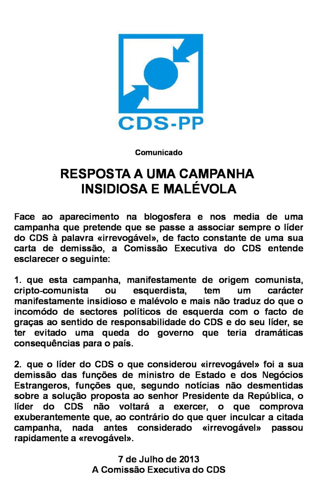 Face a este comunicado e enquanto pessoa por ele visado, só tenho a sublinhar que ele refere três vezes o termo «irrevogável» e nunca refere o líder do CDS pelo seu nome próprio, o que corresponde magnificamente à adesão do CDS à proposta que aí está na barra lateral direita deste blogue.