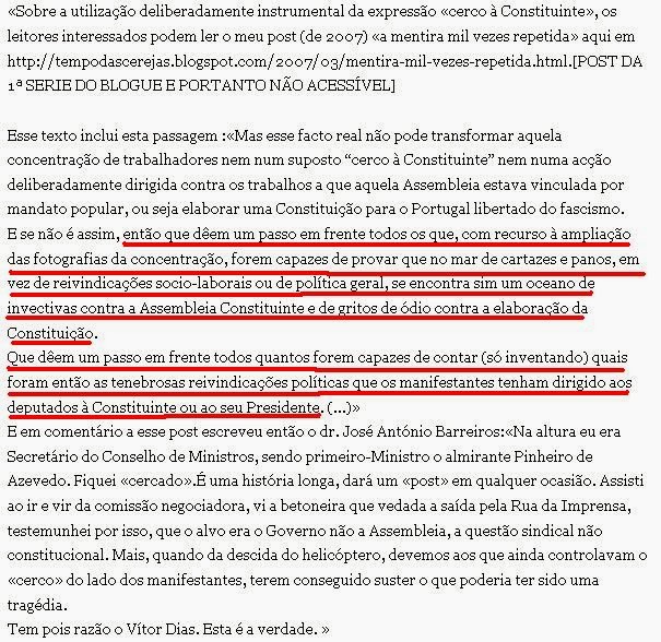 3. Por outro lado, considero que o seu problema não é não consultar ou não citar suficientemente os discursos de Álvaro Cunhal ou os documentos do PCP mas sim o de deles tirar ilações e deles fazer interpretações e descrições simplistas, ilegítimas e torcidas, em que se torna patente que a Raquel ou treslê ou não conhece a semântica do discurso comunista. Aliás, nesta sua resposta, dá um cristalino exemplo disso mesmo. Com efeito, salienta que (sublinhados meus) «Álvaro Cunhal a seguir ao 25 de Novembro diz-se descansado por os