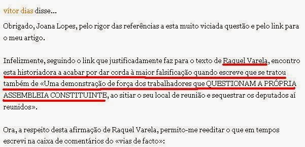 2. Fique descansada que eu nunca a acusei, acuso ou acusarei de escrever por encomenda de quem quer que seja. O que já disse e mantenho é que, quando escreve sobre o PCP, a historiadora Raquel Varela fica quase absolutamente refém da sua formação e concepções ideológicas abundantemente marcadas por uma variante de esquerdismo e esquematismo impressionantemente miméticos dos que defrontei há 45 anos.