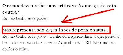 A imagem acima reproduz uma passagem da entrevista a Maria do Rosário Gama, da APRe, feita por duas esperientes jornalistas do Público. De registar que, mais à frente, é a própria Maria do Rosário Gama a referir a existência de outras organizações de reformados (aliás bem mais antigas, acrescento eu). Podem acusar-me de embirrento e miudinho mas, sem querer ofender ninguém, faz-me muita confusão e causa-me intelectualmente alguma inquietação que duas jornalistas que não são sequer principiantes, de sopetão, atribuam à APRe a representação de 2,5 milhões de reformados ! E a pergunta tranquila que faço é esta: que tipo de mundivivência e que tipo de conhecimento social pode estar por detrás desta tão atrevida quanto falsa afirmação? Ficam desde já os leitores convidados para dar a suas próprias explicações.