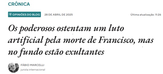 O compromisso de Francisco com os seres humanos, grandes vítimas do atual crepúsculo tempestuoso do Ocidente capitalista, o levou a tomar posições corajosas e claras sobre todas essas questões, a ponto de ser insultado por aqueles que não tiveram escrúpulos em chamá-lo de "putiniano" e "antissemita", categorias nas quais os terríveis formadores de opinião alojados vitaliciamente nos jornais e na TV tentam relegar qualquer um que expresse um pensamento crítico sobre os massacres e a devastação em curso. Hoje eles demonstram um luto artificial pela morte de Francisco, mas no fundo eles se alegram com o falecimento de um dos seus adversários mais temíveis.